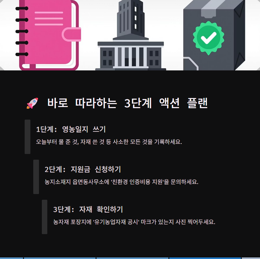 ✅ 교육 이수: 친환경 농업 의무 교육을 미리 받아두면 정말 편해요.