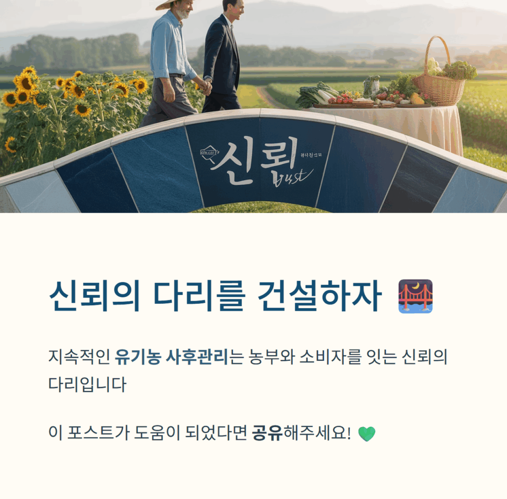 🌱 주의사항: 이 글은 생산자분들의 이해를 돕기 위한 일반적인 정보 제공을 목적으로 합니다. 실제 인증 과정의 법적 효력을 갖지 않으며, 정확한 절차와 기준은 반드시 국립농산물품질관리원(NAQS) 및 지정 인증기관의 공식 안내를 확인하시기 바랍니다.