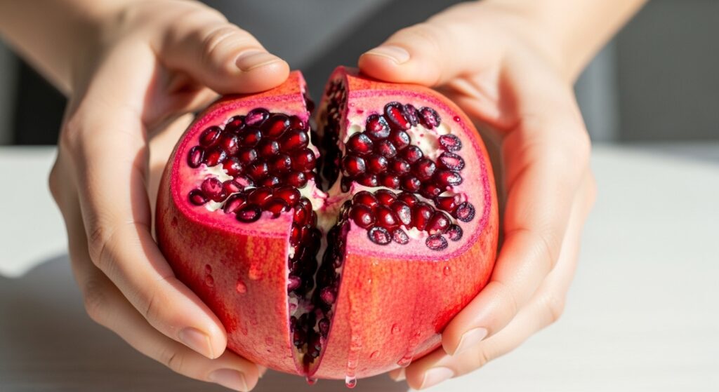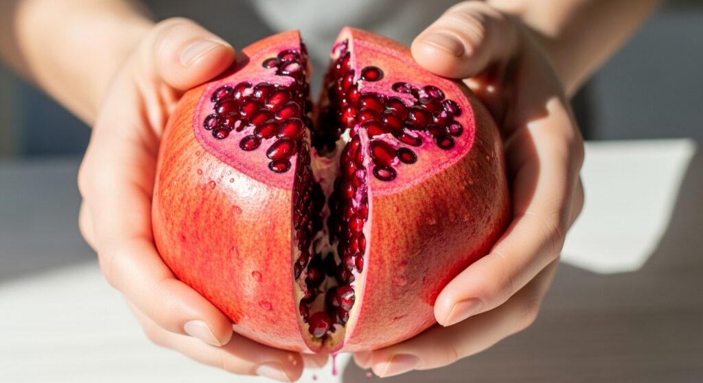 - 분리 및 쪼개기: 칼집을 따라 손으로 살살 벌려주면, 석류가 하얀 속껍질을 중심으로 꽃잎 모양처럼 쉽게 여러 조각으로 쪼개집니다. 이렇게 쪼개진 상태가 알맹이를 빼기 가장 쉬운 상태입니다.