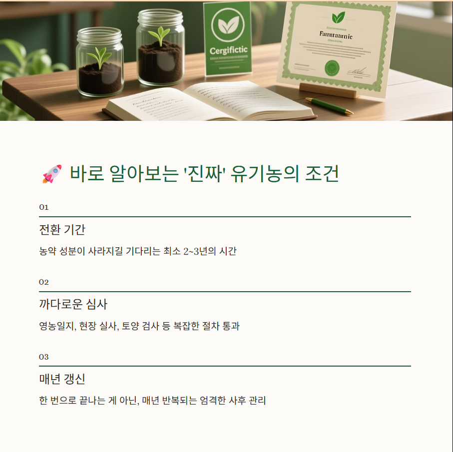 ✅ 최소 2-3년의 전환 기간: 화학비료와 농약을 쓰던 땅이라면, 그 성분이 모두 사라질 때까지 유기농 방식으로만 농사를 지으며 기다려야 해요. 이 기간 동안은 유기농으로 팔지도 못해요.
