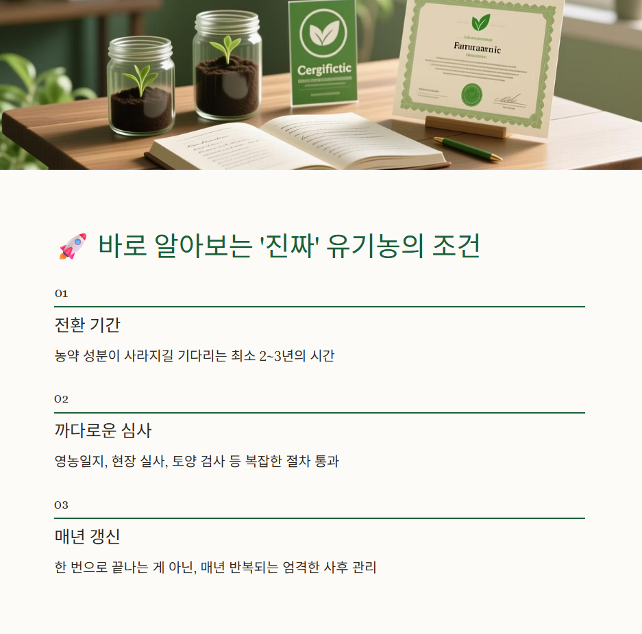 ✅ 최소 2-3년의 전환 기간: 화학비료와 농약을 쓰던 땅이라면, 그 성분이 모두 사라질 때까지 유기농 방식으로만 농사를 지으며 기다려야 해요. 이 기간 동안은 유기농으로 팔지도 못해요.