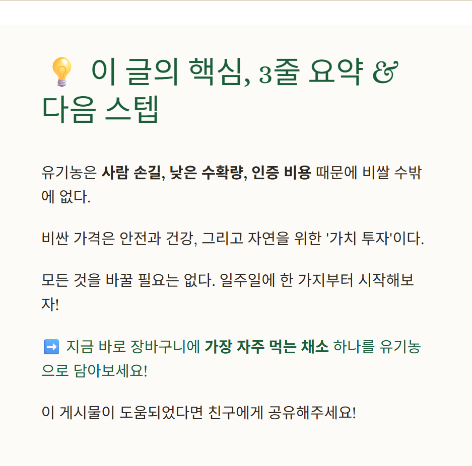 유기농 식품의 가격은 단순한 비용이 아니라, 더 많은 땀과 시간, 그리고 안전을 위한 약속에 대한 ‘가치’입니다. 이제 장바구니 앞에서 조금 덜 망설이게 되시길 바라요!