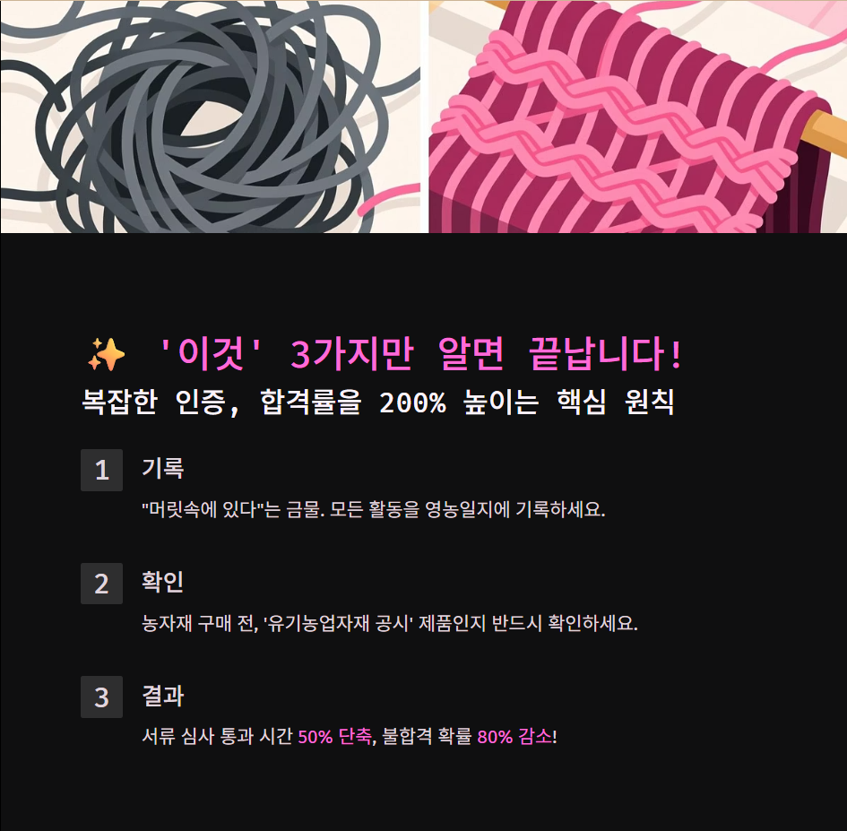 ✅ 서류 심사: 언제 어떤 퇴비를 썼고, 어떻게 병충해를 관리했는지 모든 영농 과정을 꼼꼼하게 기록한 ‘영농일지’를 제출해야 합니다.