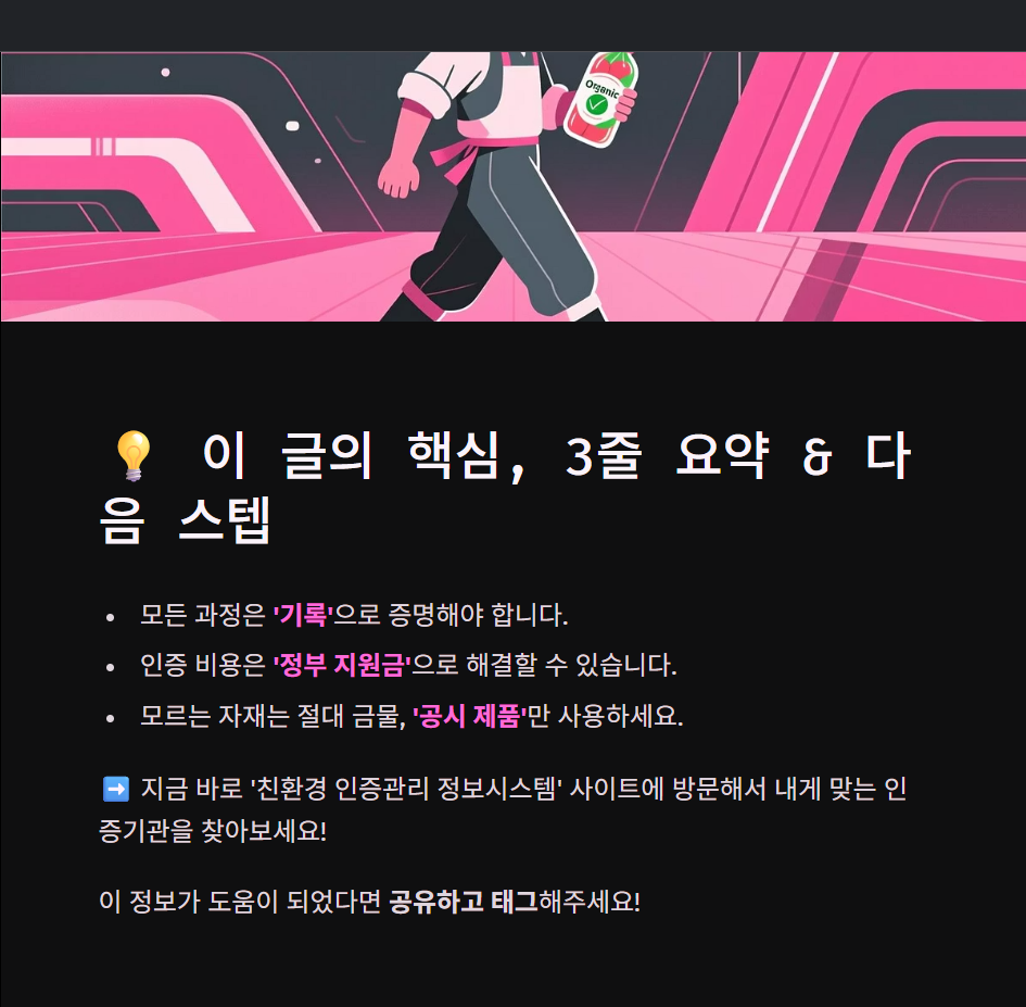 ✅ 인증 갱신: 한 번 인증받았다고 끝이 아니에요. 매년 이 모든 과정을 반복해서 인증을 갱신해야만 유기농 마크를 유지할 수 있습니다. (친환경농산물안전성센터 참고)